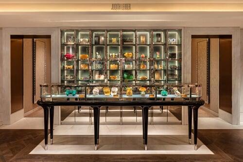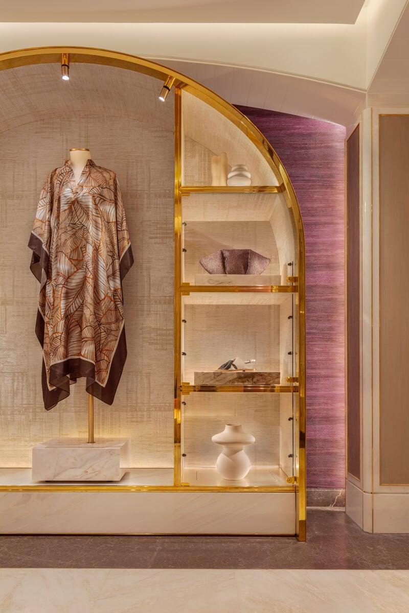 The ambient warm light in the space, is punctuated by low glare high colour rendering spotlighting, creating contrast to accentuate the luxurious fabrics. LDI took care to ensure minimal amounts of direct illumination to the floor, ensuring garments, hats a product displays are the main feature.