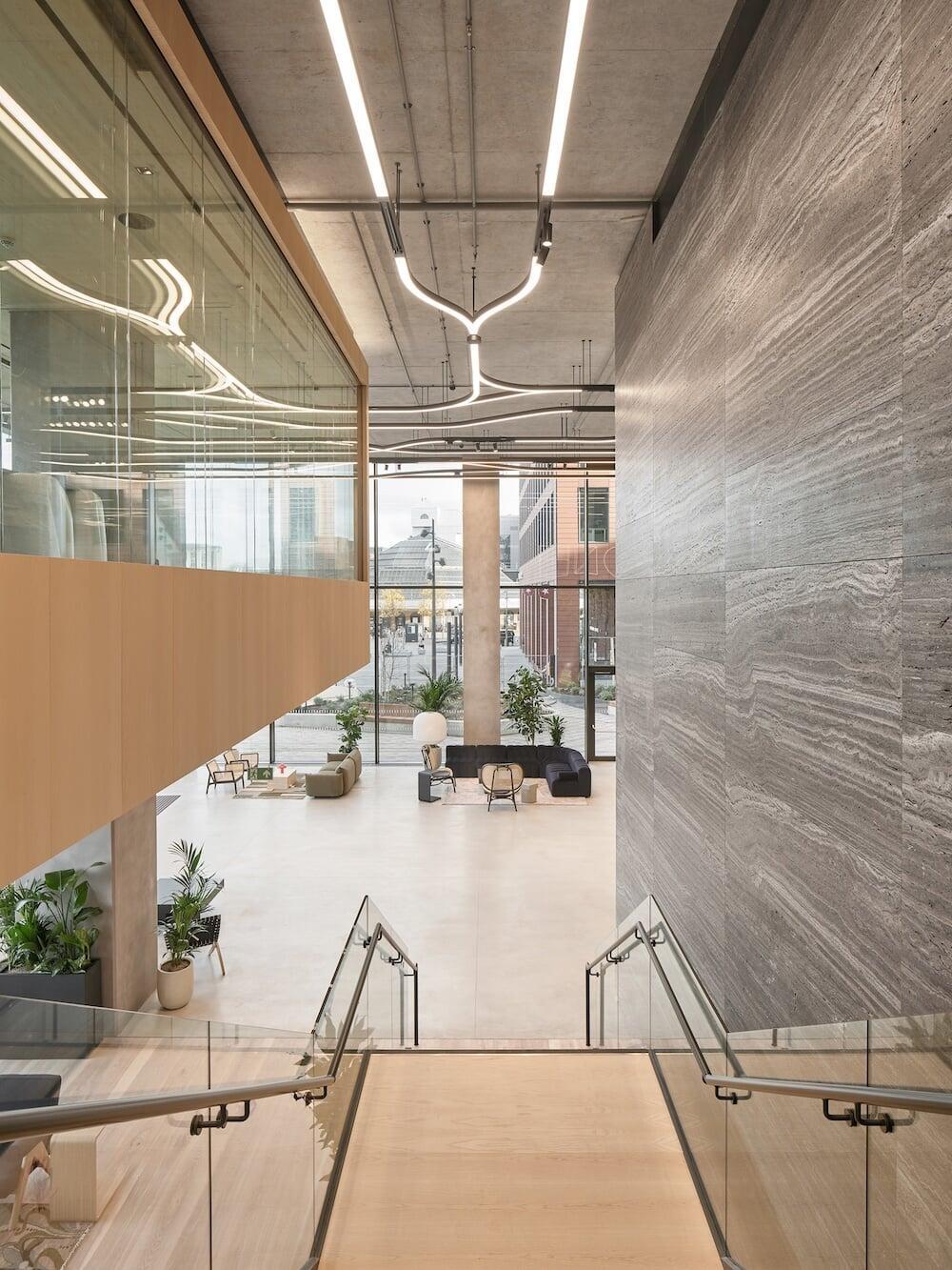 Upon entering the triple-height lobby of One Station Hill, the immediate focal point is the lush, full-height living wall behind the reception desk. Lighting a living wall presents unique challenges and can feel counter intuitive, but when done correctly, it brings the space vividly to life. The luminaires required to illuminate the wall are carefully concealed within the custom-designed feature lighting track.