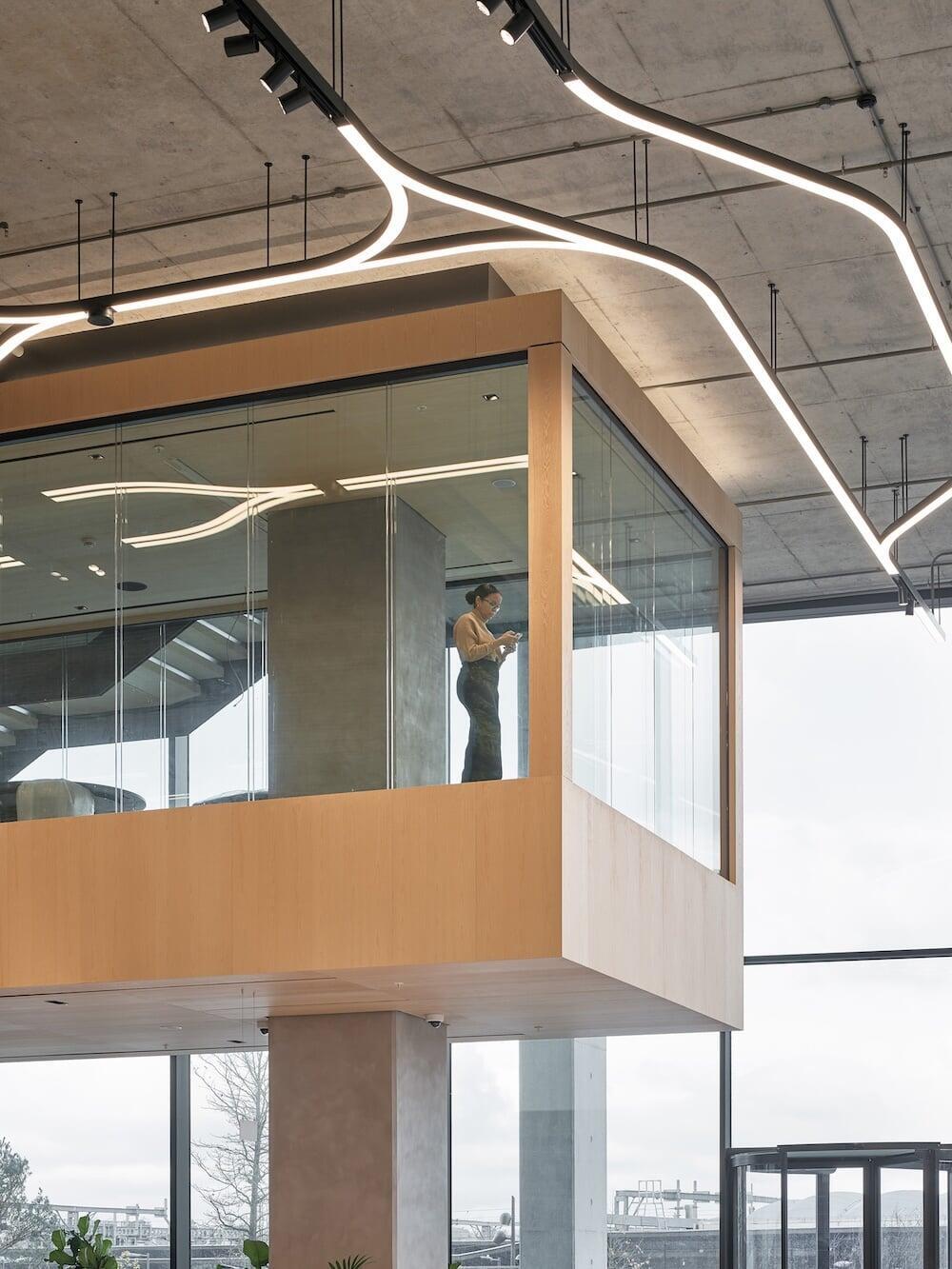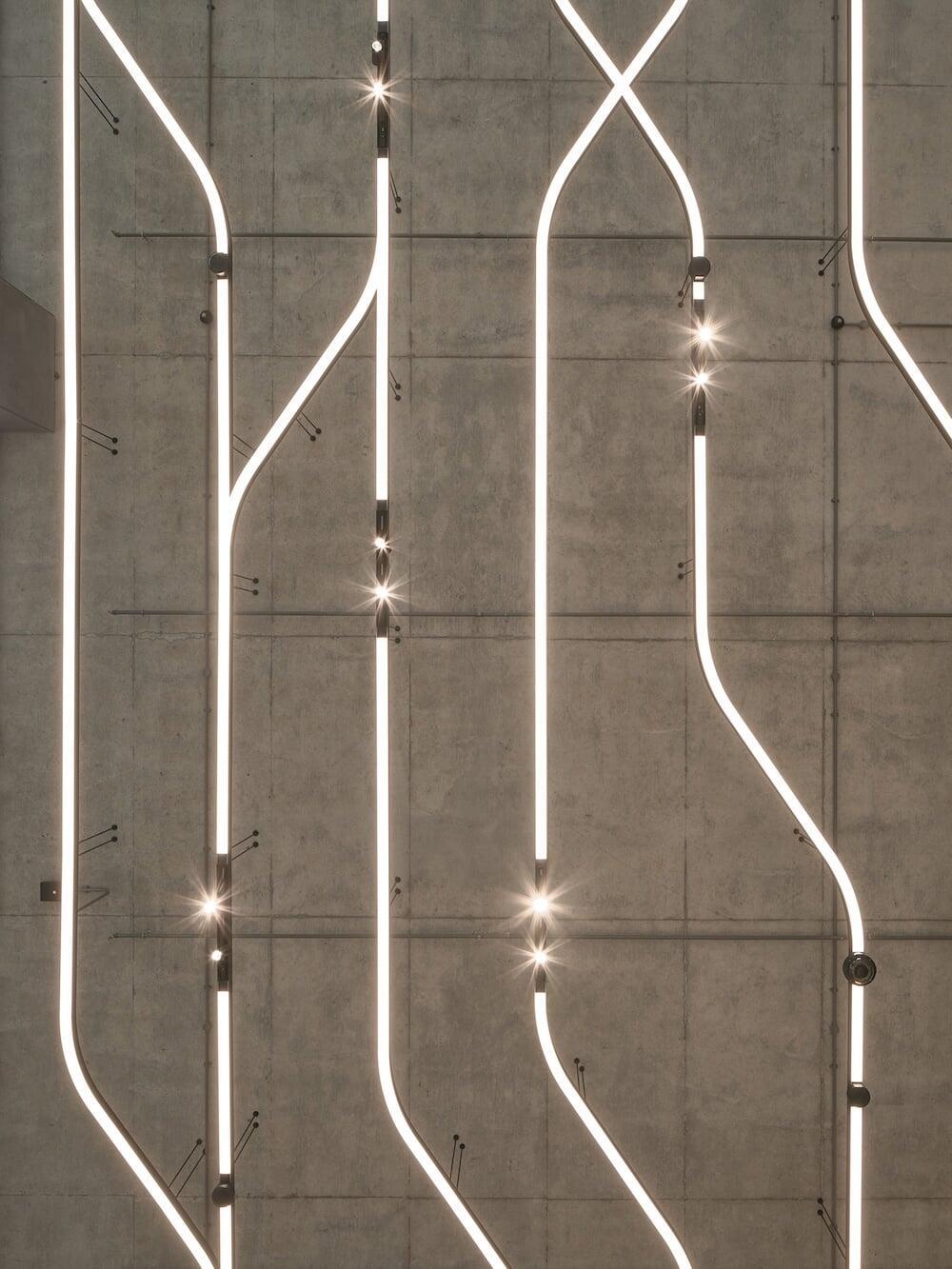 To achieve the necessary accent lighting for seating, circulation areas, and the living wall, a surface-mounted track and spotlight system was chosen. This system is integrated into a bespoke profile that also includes linear diffused lighting to highlight the flowing curves of the track’s frame, whilst at the same time providing additional uplift of ambient illumination for the lobby, whilst housing emergency lighting, loudspeakers, and CCTV cameras.